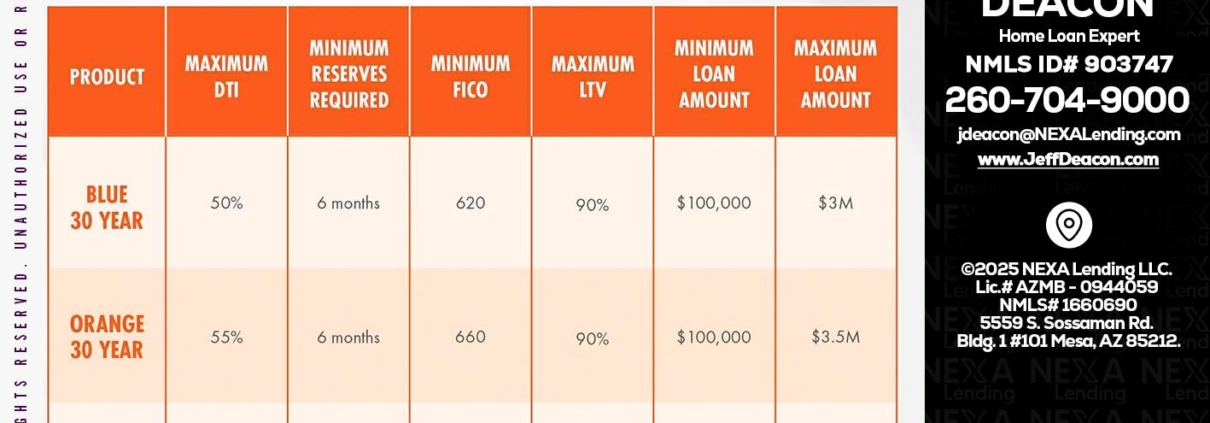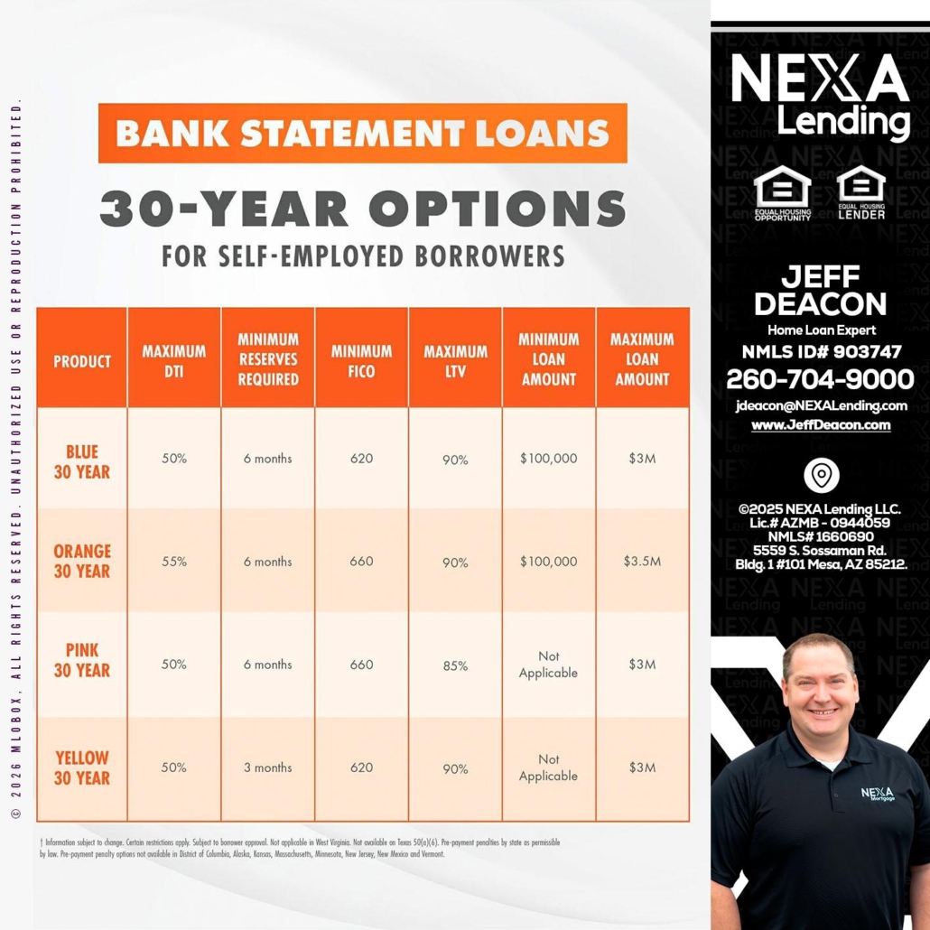 30 YEARS OPTIONS - Jeff Deacon -Home Loan ExpertHi, my name is Jeff Deacon. I’m a Loan Officer with NEXA Mortgage LLC., offering personalized mortgage solutions, fast customized quotes, great rates and service with integrity.