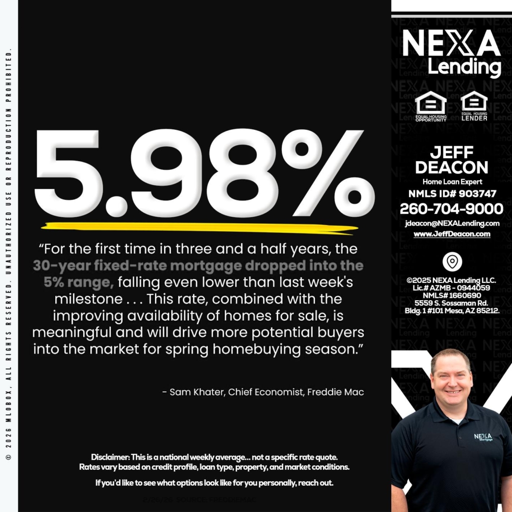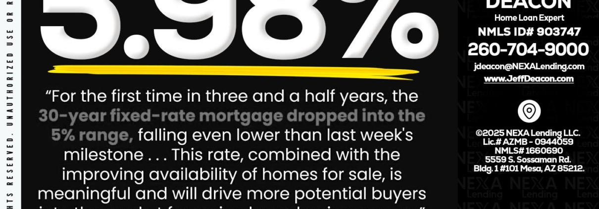 Hi, my name is Jeff Deacon. I’m a Loan Officer with NEXA Mortgage LLC., offering personalized mortgage solutions, fast customized quotes, great rates and service with integrity.