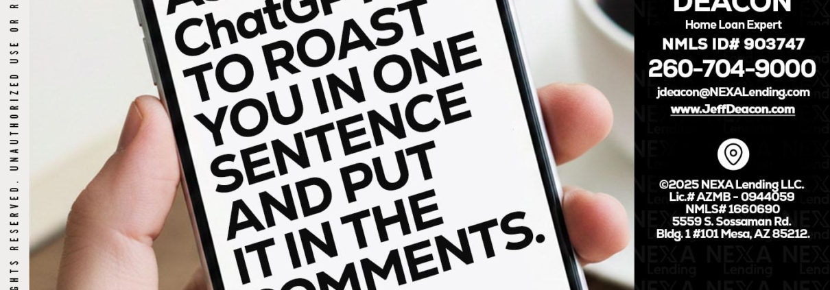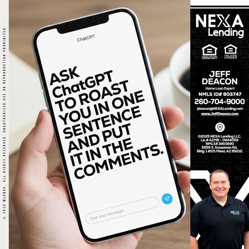 ask chatgpt - Jeff Deacon -Home Loan ExpertHi, my name is Jeff Deacon. I’m a Loan Officer with NEXA Mortgage LLC., offering personalized mortgage solutions, fast customized quotes, great rates and service with integrity.
