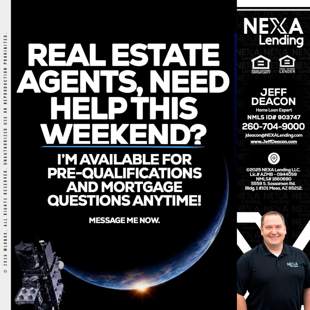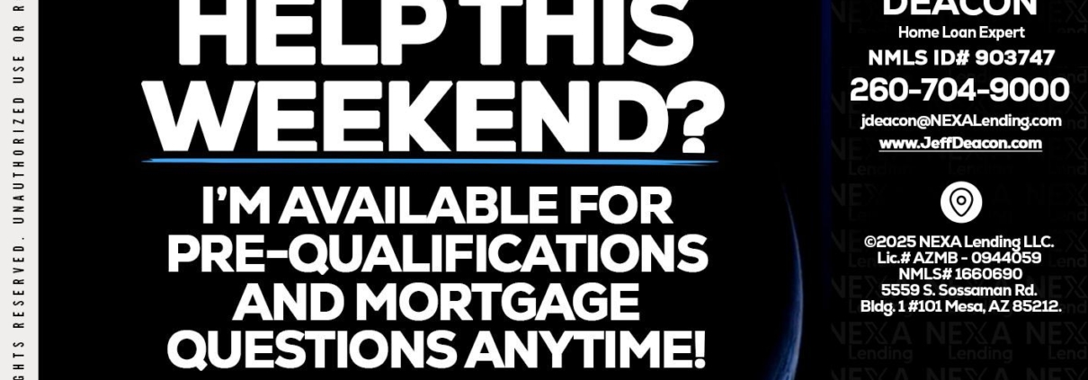Hi, my name is Jeff Deacon. I’m a Loan Officer with NEXA Mortgage LLC., offering personalized mortgage solutions, fast customized quotes, great rates and service with integrity.