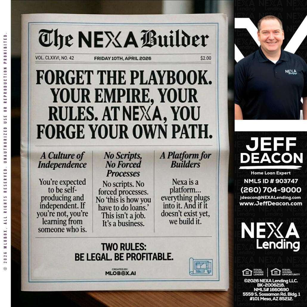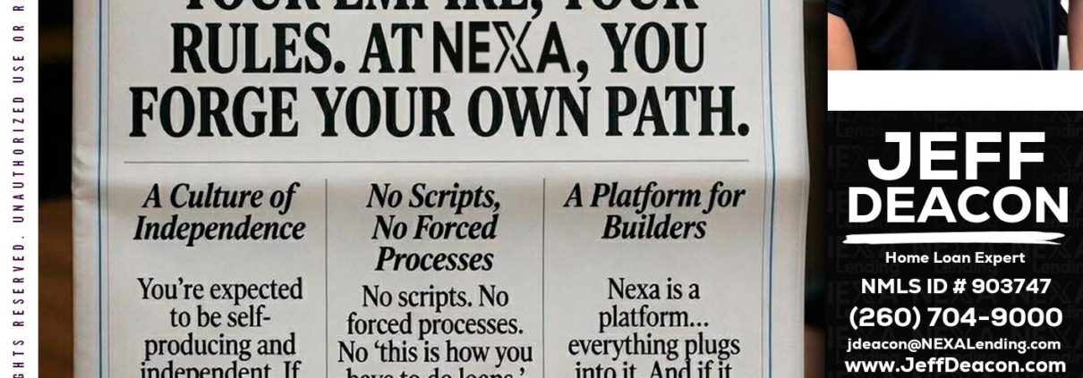 Hi, my name is Jeff Deacon. I’m a Loan Officer with NEXA Lending LLC., offering personalized mortgage solutions, fast customized quotes, great rates and service with integrity.