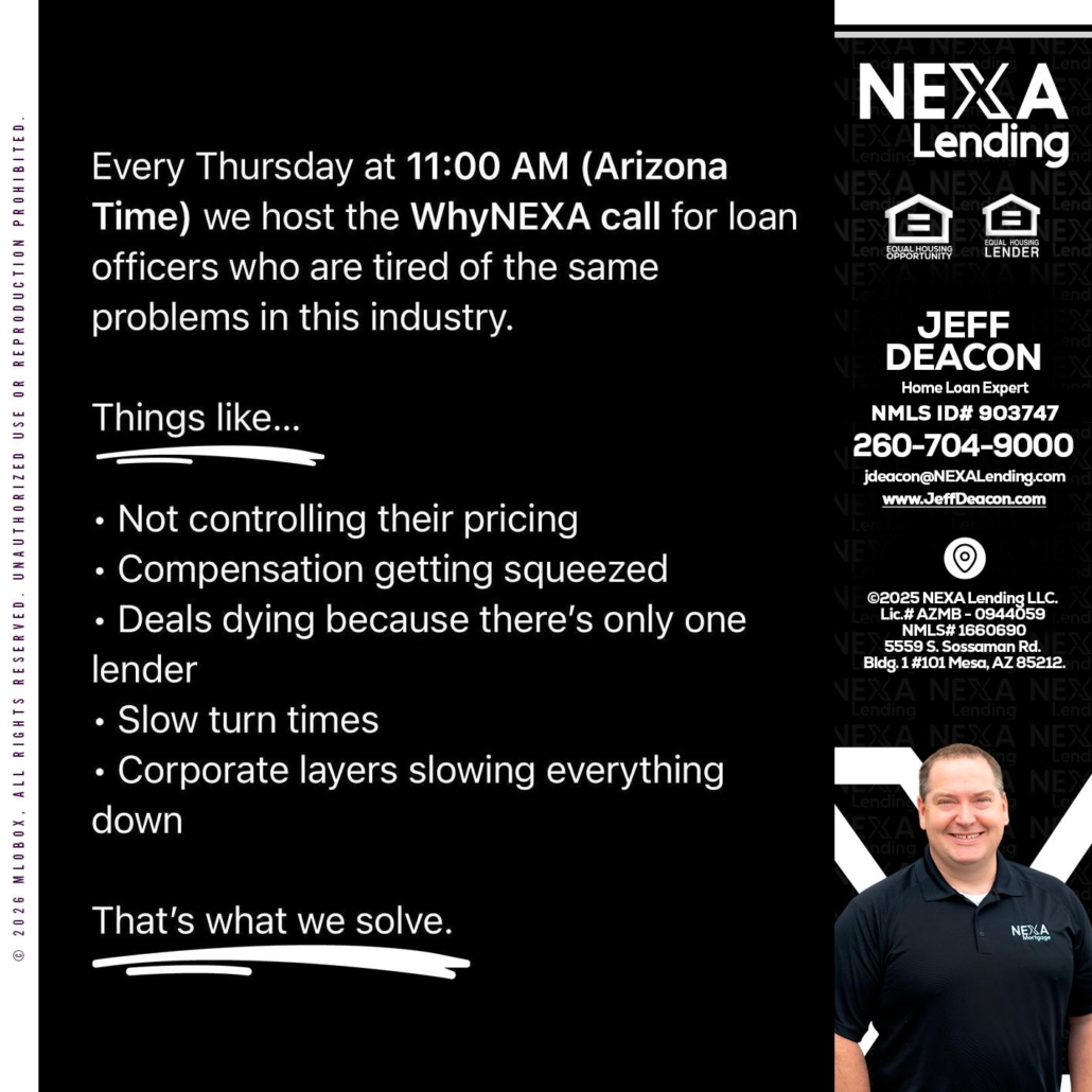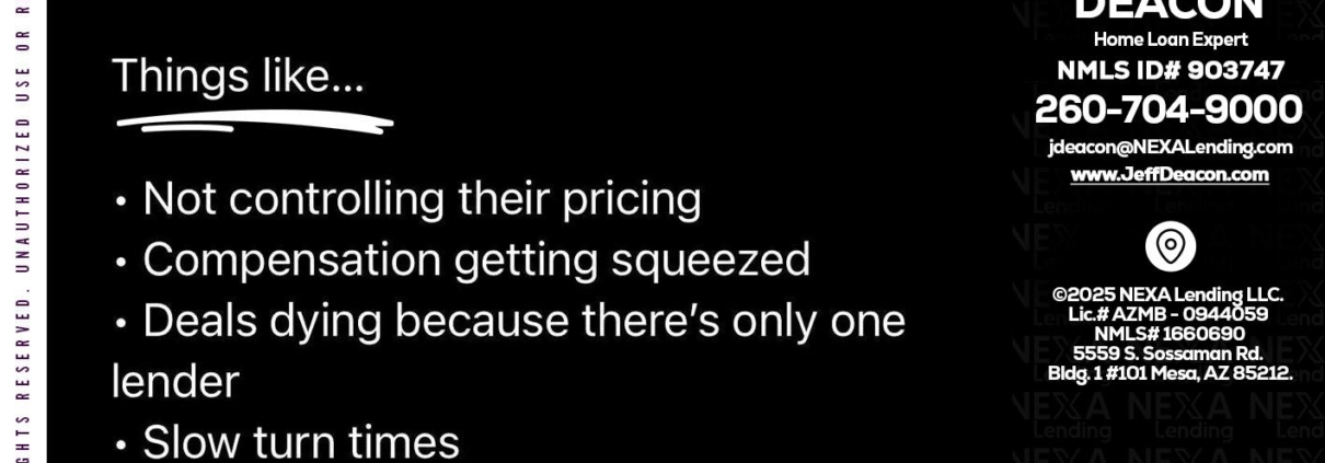 Hi, my name is Jeff Deacon. I’m a Loan Officer with NEXA Mortgage LLC., offering personalized mortgage solutions, fast customized quotes, great rates and service with integrity.